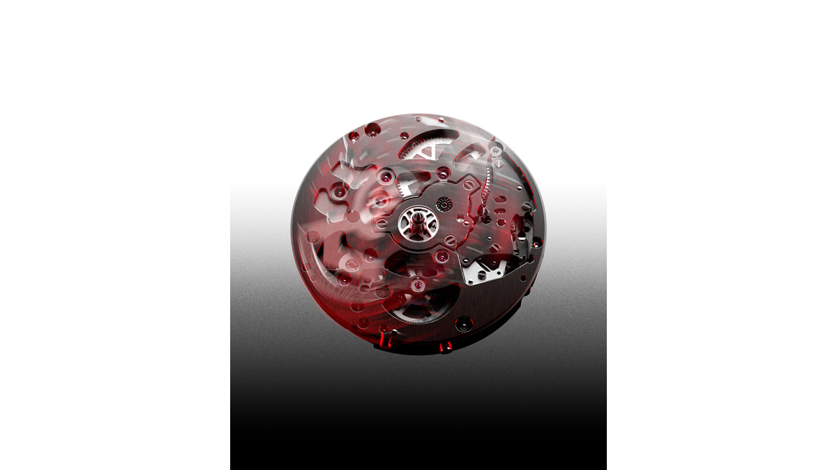 タキメーターと1/5秒目盛りが配されたフランジは、風防の輪郭に沿って湾曲し、視差誤差を最小限に抑える一方、半透明のサファイアクリスタルダイヤルにより、ムーブメントの卓越した仕上げを視覚的に堪能することが可能。
