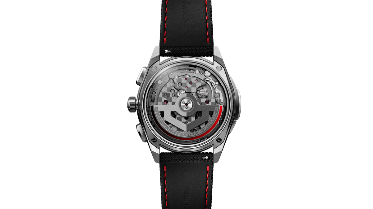 その頂点に位置するのが、グラテ技法を用いて一つひとつ手作業で施される、シグネチャーのチェッカーフラッグ モチーフ。タグ・ホイヤーの最高峰ムーブメントであることを示す象徴だ。