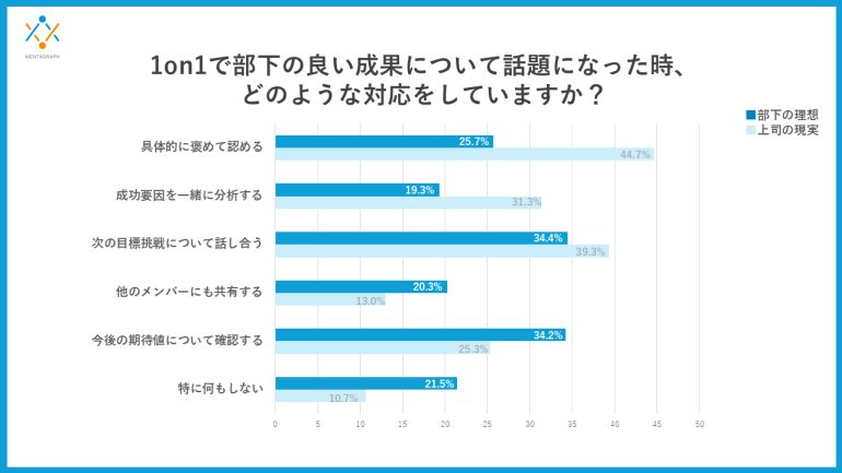 1on1 MTGで部下の良い成果についての話題になった時、部下は「次に進めるための設計」を望む人が多かった。具体的には「今後の期待値の確認」は部下の理想が34.2%に対して、上司の現実は25.3%で8.9ポイントも差があった。「次の目標挑戦の話し合い」は部下の34.4%に対して、上司は39.3%だった。
