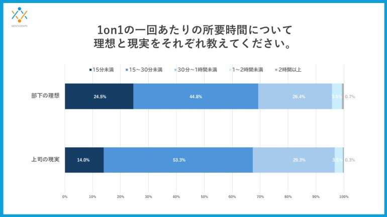 1on1 MTGの1回当たりの理想の所要時間は、部下の理想では「15分未満」が24.5%に対して、上司の現実では14.0%だった。「15~30分未満」は上司の現実が53.3%に対して、部下の理想は44.8%で上司が8.5ポイントも上回る結果になった。部下の理想では、全体として短時間・高密度の面談設計を求める傾向があった。