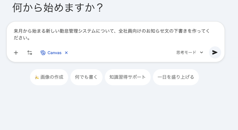 通常どおりプロンプト入力欄に文章を指示すると、Canvas対応の場合は編集用の画面が展開される。例えば今回は「来月から始まる新しい勤怠管理システムについて、全社員向けのお知らせ文の下書きを作ってください」と入力。