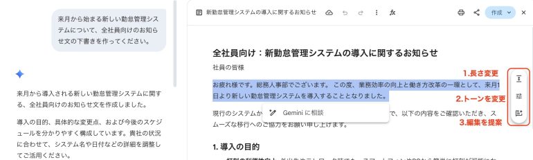 例えば、全社員向けのお知らせ文を簡潔にまとめたり、カジュアルな表現をフォーマル寄りに整えたりといった修正が即座に行える。文章の方向性が定まらない場合でも、「編集を提案」を使えば、Geminiから改善案を受け取れるため、推敲の手間を減らせる。