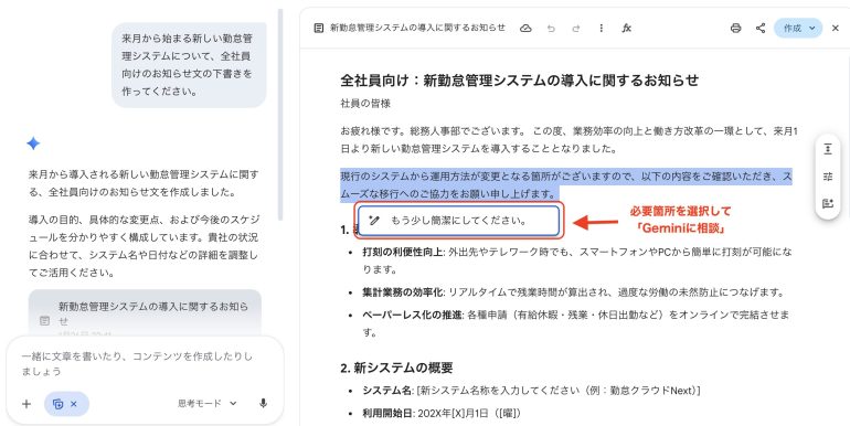 もう一つの特徴が、生成されたテキストの一部について、ピンポイントでGeminiに相談できる点。文章の中で気になる箇所を選択すると、その部分だけを対象に修正や書き換えを依頼できる。全体を作り直す必要はなく、「もう少し簡潔にしたい」「説明を補足したい」といった細かな調整が可能だ。