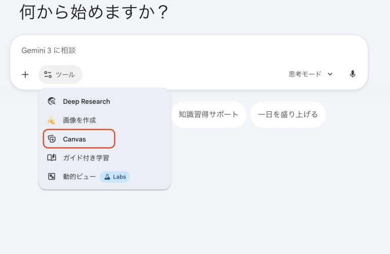 Canvasは、ツールから「Canvas」を選択するだけで、Geminiの画面から簡単に呼び出せる。