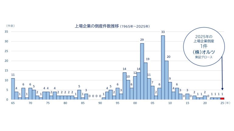 2025年の上場企業倒産(12月29日16時30分現在)は、(株)オルツ(東証グロース)の1社となった。コロナ禍以降(2020年以降)で6社目となる。