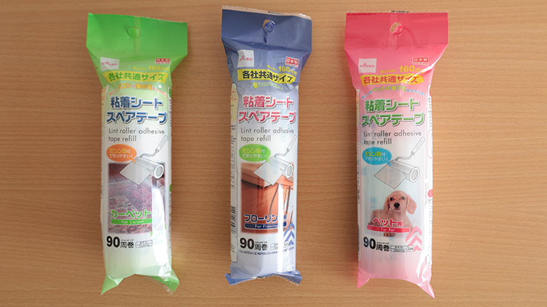 ここからはスペアテープを紹介。まずは、バリエーションが「カーペット用」「ペット用」「フローリング用」の3種類あって、売り場で一番目立つこの商品から。幅は16cmで90回分あるのは共通で、用途が異なる。「カーペット用」は一般的なテープで、「ペット用」はペットの抜け毛に最適なテープとなる。