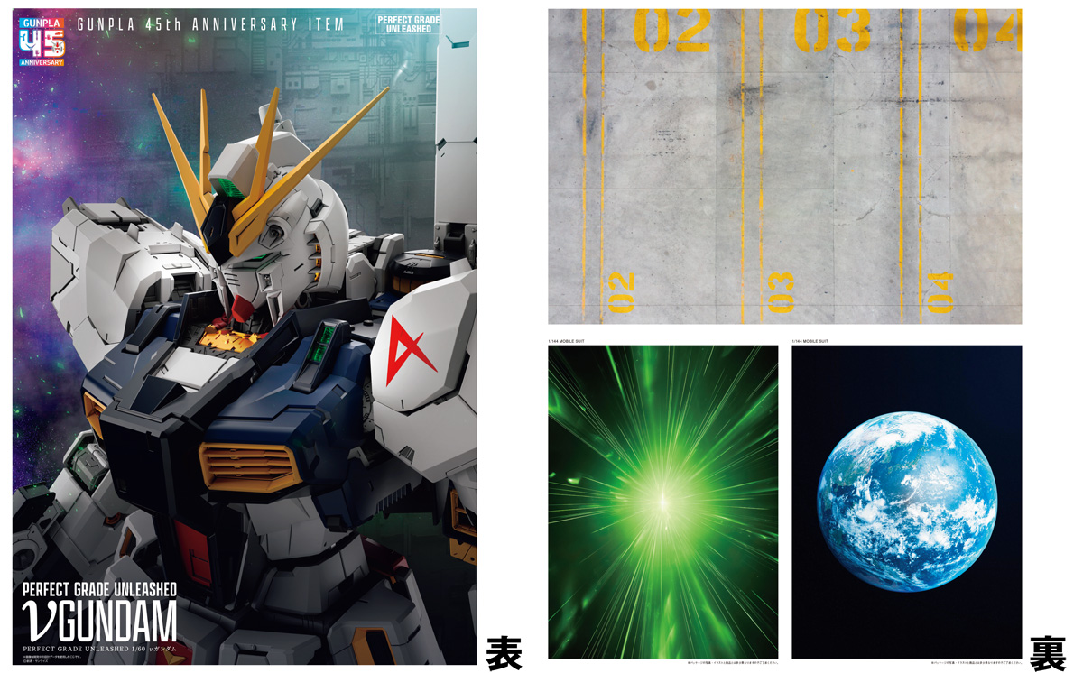 本書の巻末には、綴じ込み式でB3サイズの特大ポスターを付録。『PG UNLEASHED 1/60 νガンダム』の精密感を実感できるキービジュアルと、格納庫や宇宙などをイメージしたビジュアルを、表面と裏面にそれぞれプリントしたレアアイテムです。プラモデルを作る部屋に飾ったり、ディスプレイしたプラモデルの背景に貼ったりと様々に活用できます。
