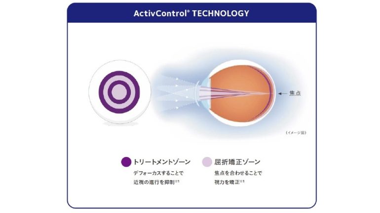 焦点を合わせることで視力を補正する「屈折矯正ゾーン」、デフォーカスすることで 近視の進行を抑える「トリートメントゾーン」が交互に配置された同心円型の二重焦点レンズデザイン「ActivControl テクノロジー」を採用。視力補正と同時に、近視の原因のひとつである眼軸長の伸長を抑えることで、近視の進行を抑制する効果がある。