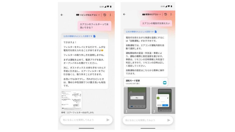 もう一つの大きな進化が、クラウドサービスと連携した生成AIによるサポートだ。 Rシリーズは、スマートフォンと連携させることでエアコンの使い方やお手入れ方法などの疑問に自然な会話で回答。「電気代を抑えるには?」といった抽象的な問いに対しても、AIが膨大な取扱説明書やデータベースから最適な解決策を提示。質問の内容によってはアプリ内の設定画面までスムーズに誘導してくれる。多機能化ゆえの「使いこなせない」という不満に対し、AIを介在させることで誰でも機能をフル活用できる仕組みを構築した。