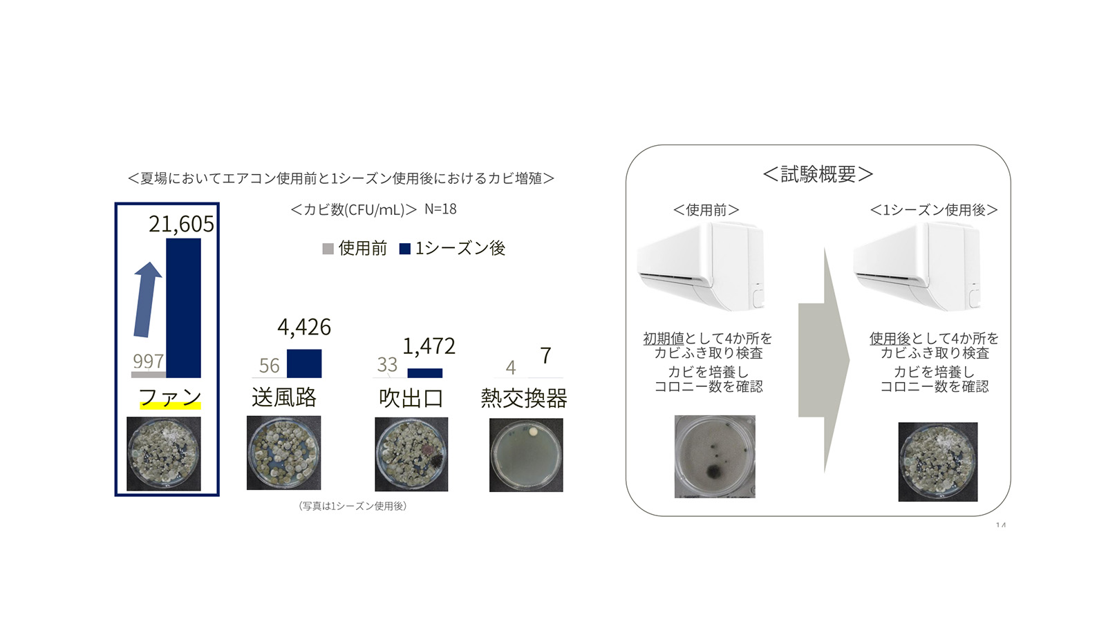 しかし、家庭で実際に使われている18台のエアコンで調べたところ、最もカビの汚染リスクが高いのは熱交換器よりも空気を送り出す「送風ファン」。むしろ、熱交換器はすでに多くの製品でカビ対策が行われているためか、カビの発生はかなり限定的だった。