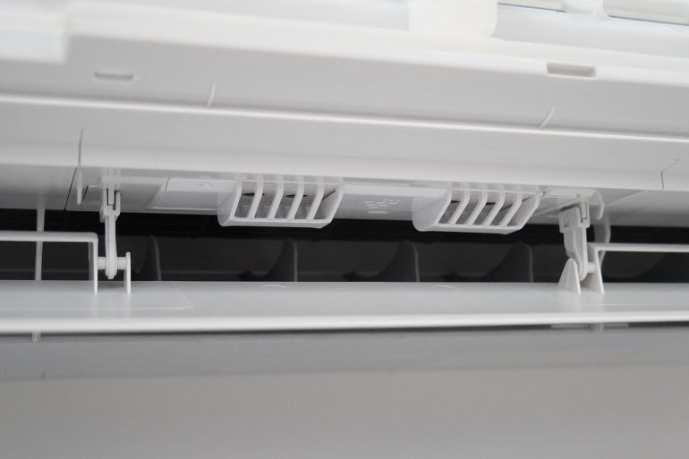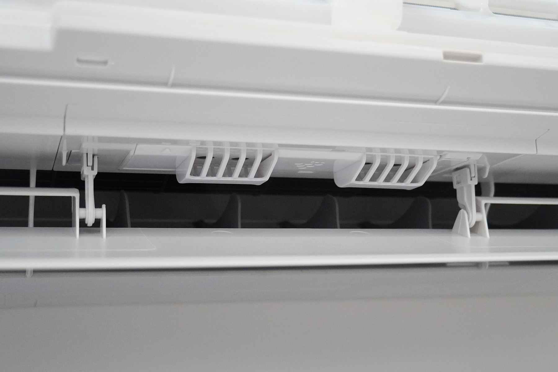 この課題に対し、新Rシリーズは「室内機の2デザイン展開」という解決法をとった。エアコンは通常、能力によって室外機が変わることはあっても、同一シリーズ内では同じデザインの室内機を採用するのが通例だ。そんな常識のなか、Rシリーズは6畳~8畳用の2モデルにコンパクトなサイズの専用シャーシを採用した。これにより、6畳~8畳用は高さを24.9cmに抑制。シャープによれば、2027年度新省エネ基準を100%達成した2.2~2.5kWクラスのエアコンにおいて、室内機の高さは業界最小だという。最近は窓の上の限られた隙間にエアコンを設置する家庭も多いが、このサイズ感なら狭いエリアにも無理なく設置が可能だ。