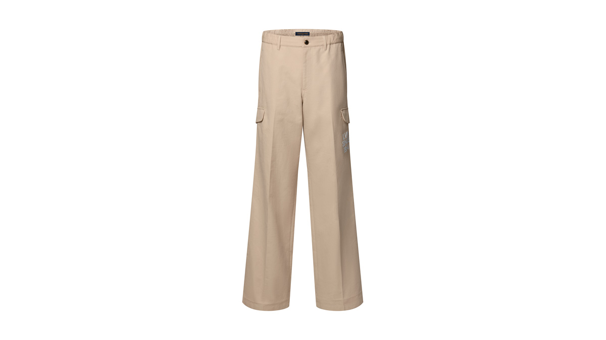 2026春夏コレクションに登場した、左脚に施されたホワイトの LV アルファベットのシグネチャー刺繍が、存在感のあるアクセントを添えている。