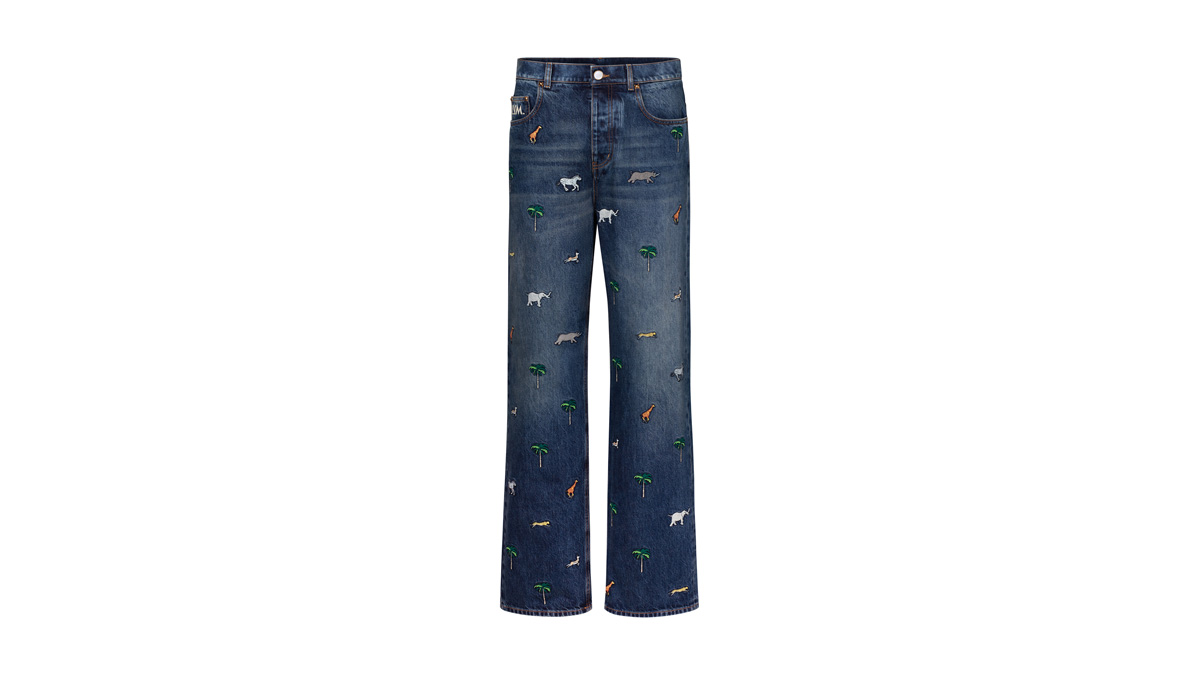 ルイ・ヴィトンが映画『The Darjeeling Limited(ダージリン急行)』のために制作したモチーフが美しい、グラフィカルなデニムスケートパンツ。ヤシの木や動物の鮮やかな刺繍が全面に施された、2026春夏ファッションショーのアイコニックなアイテム。
