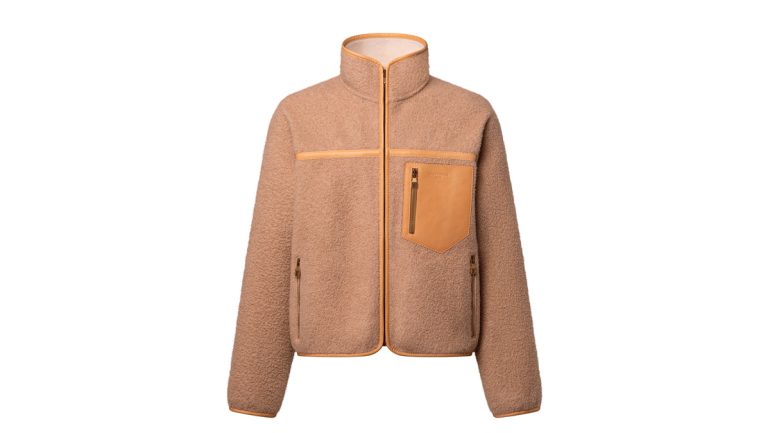 クラシカルなキャメルカラーのカシミヤ100%のダブルフェイス素材を使用し、エッジやヨーク、胸元にヌメ革のトリミングを施した。ファスナー付きのレザー製の胸ポケットには、「Louis Vuitton Paris」のシグネチャーをさりげなくあしらい、上品な印象をプラス。