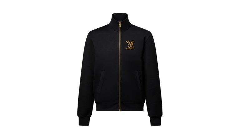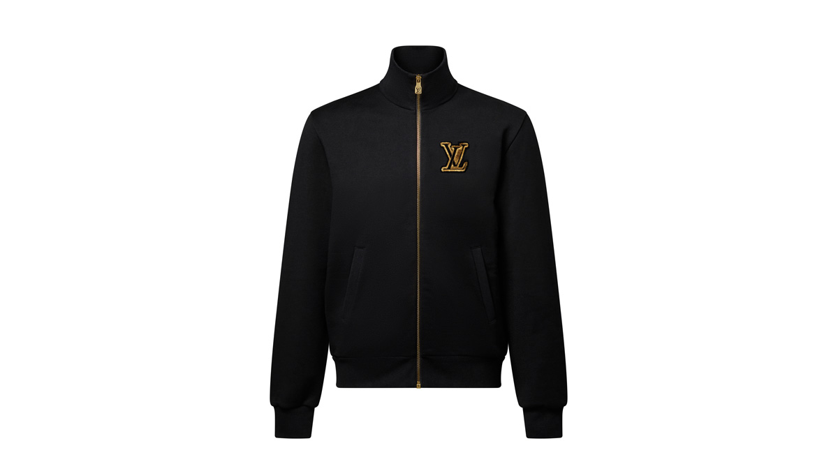 カジュアルな装いにスマートなアクセントを添える、ブラックのファスナー付きトラックトップ。オーガニックコットンを使用し、胸元にはゴールドカラーのスパンコールと刺繍で施された上品なLV パッチを配した。