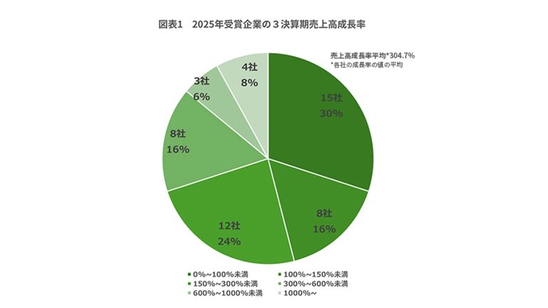 この4社を含め7社が600%(7倍)以上で前回より1社減、300~600%未満は8社、150~300%未満が12社、100~150%未満が8社、0~100%未満は15社という結果に。全体的な売上高成長率は前回に引き続き高い伸びを示しており、平均は304.7%だった(図表1)。