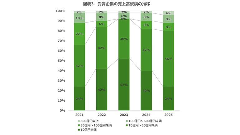 受賞企業の売上高規模は、50億円未満(10億円未満、10億~50億円未満の合計)の企業が全体の80%を占めており、前回とほぼ同じ水準となった。