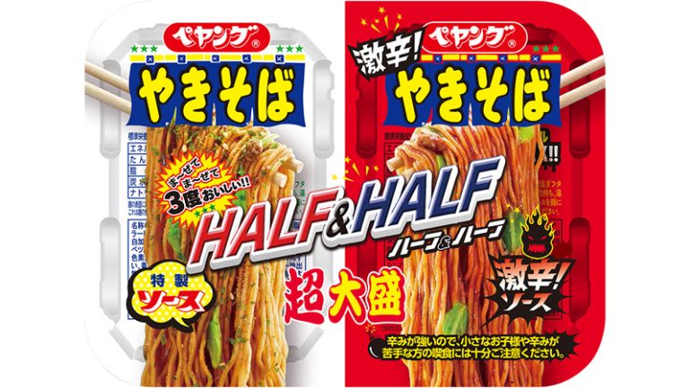麺を2つ入れた「超大盛」に「激辛」&「定番」の2種類の味を組み込んだ『超大盛やきそば ハーフ&ハーフ激辛』は、過去のヒット商品のハイブリットといえる商品だ。2つの麺は湯切りを一緒に行ない、ソースをそれぞれ絡めるというスタイル。紅白のパッケージで2種の味をわかりやすく表現した。