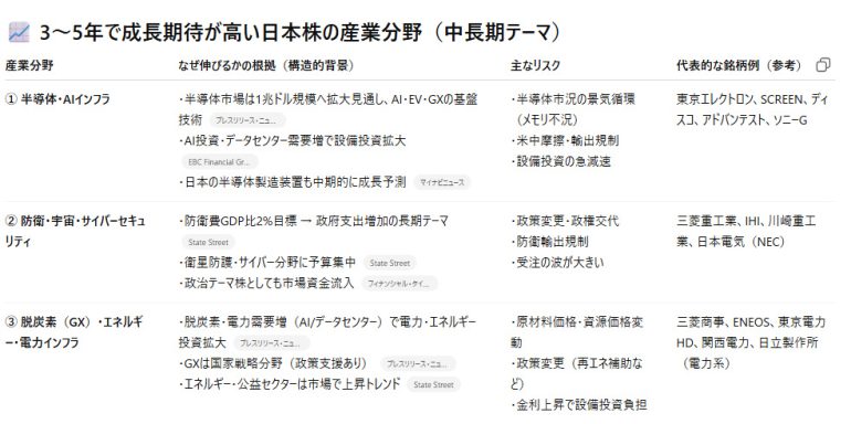 →「3~5年の中長期で成長しそうな日本株の産業分野を3つ、さらにそれぞれの『なぜ伸びるかの根拠』『リスク』『代表的な銘柄』を表形式でまとめて」