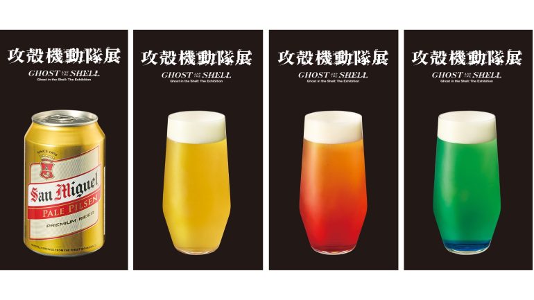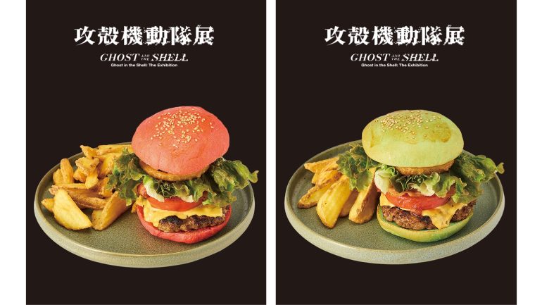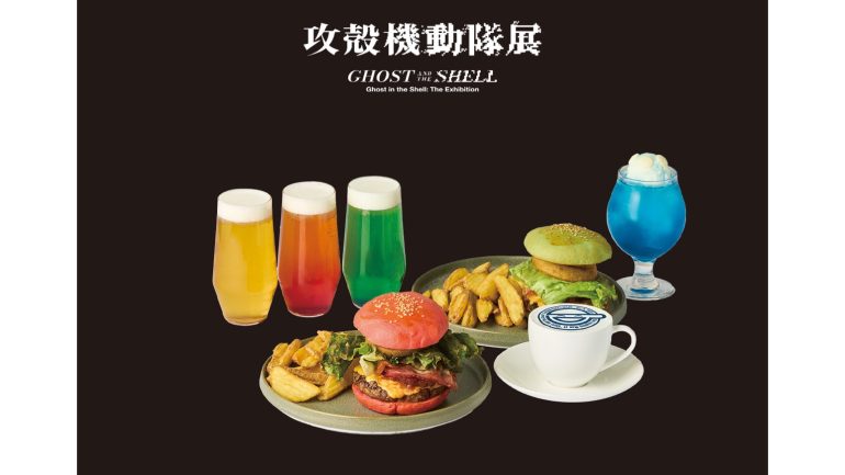 「攻殻機動隊」シリーズに登場する「タチコマ」と「フチコマ」のイメージカラーのグルメバーガーをはじめ、ラテのフォームをハッキングした笑い男ラテや「タチコマ」をモチーフにしたリンゴ味のクリームソーダ、1995年の『GHOST IN THE SHELL / 攻殻機動隊』の中で愛飲する「サン・ミゲール」に加えて、タチコマ、フチコマをイメージした赤と緑のビールなど、作品の世界が広がる多彩なグルメラインアップを楽しみたい。
