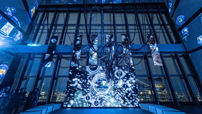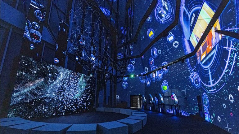 本展の入口をくぐると、来場者は「攻殻機動隊」の情報ネットワークに接続する「NODE(思考の結節点)」へと導かれる。目の前に広がるのは、作中に描かれる「電脳空間」を想起させる巨大な没入空間だ。