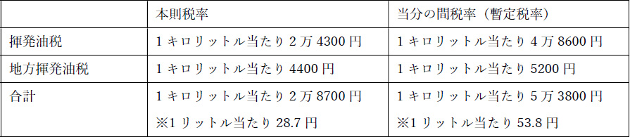 それ以前は道路特定財源(=自動車の利用者が負担する、道路の整備費として用いられる財源)として利用するため、揮発油税と地方揮発油税に暫定税率が設けられていました。