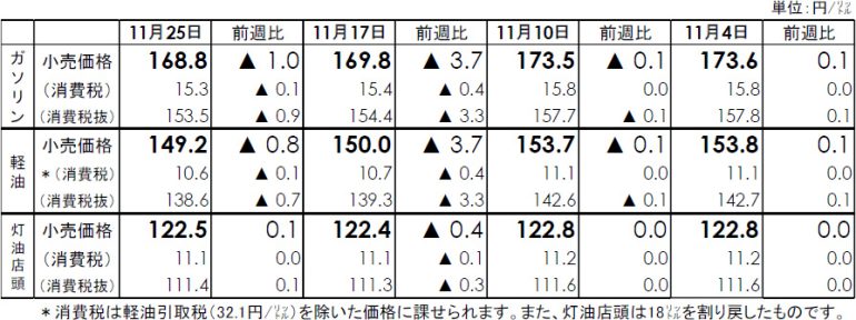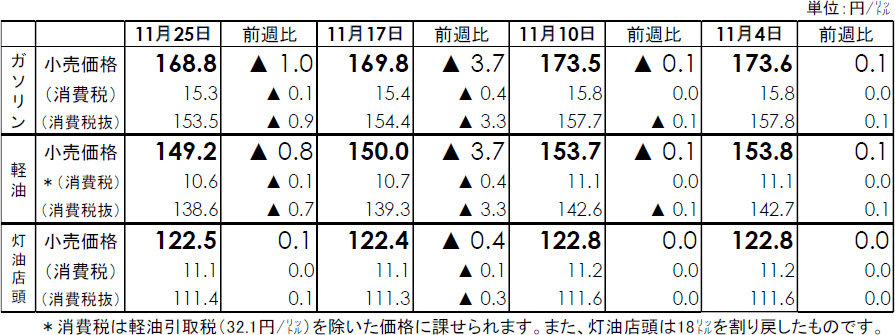 資源エネルギー庁の調査によれば、ガソリンの給油所小売価格は以下のように変化しています。11月10日から11月17日にかけて、ガソリンの小売価格が1リットル当たり173.5円から169.8円に下がっていますが、これは補助金の増額を反映したものと考えられます。