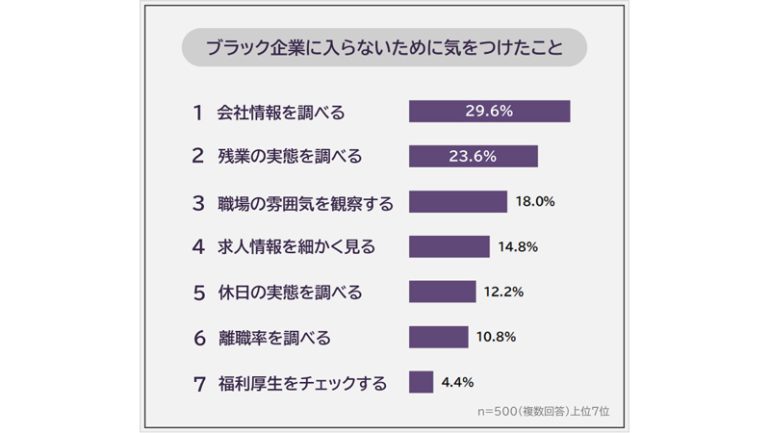 「ブラック企業に入らないために気をつけたこと」を聞いたところ、1位は「会社情報を調べる」(29.6%)となり、以下、2位「残業の実態を調べる」(23.6%)、3位「職場の雰囲気を観察する」(18.0%)、4位「求人情報を細かく見る」(14.8%)、5位「休日の実態を調べる」(12.2%)と続いた。