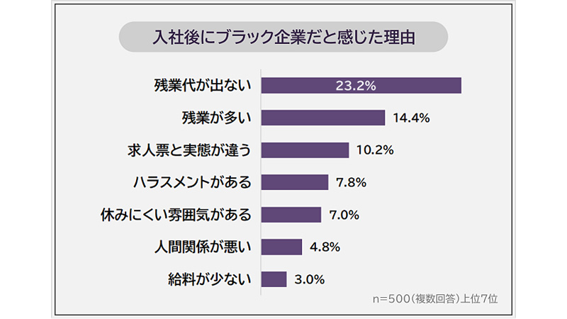 入社後にブラック企業だと感じた理由について尋ねたところ、1位は「残業代が出ない」(23.2%)となり、以下、2位「残業が多い」(14.4%)、3位「求人票と実態が違う」(10.2%)、4位「ハラスメントがある」(7.8%)、「休みにくい雰囲気がある」(7.0%)と続いた。