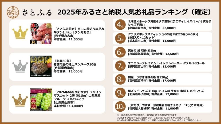 ふるさと納税ポータルサイト「さとふる」を運営するさとふるはこのほど、同ポータルサイトにおける2025年人気お礼品ランキング(確定版)を発表した。