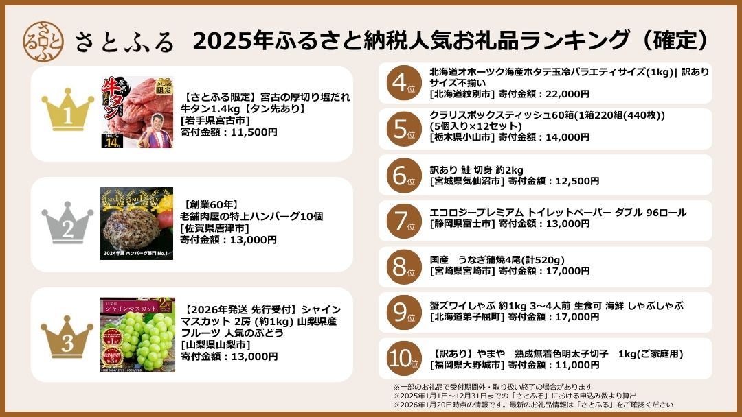 2025年人気お礼品ランキング(確定版)では、6年連続で首位を獲得していた「ホタテ」を抑え、岩手県宮古市の「厚切り塩だれ牛タン」が1位に輝いた。