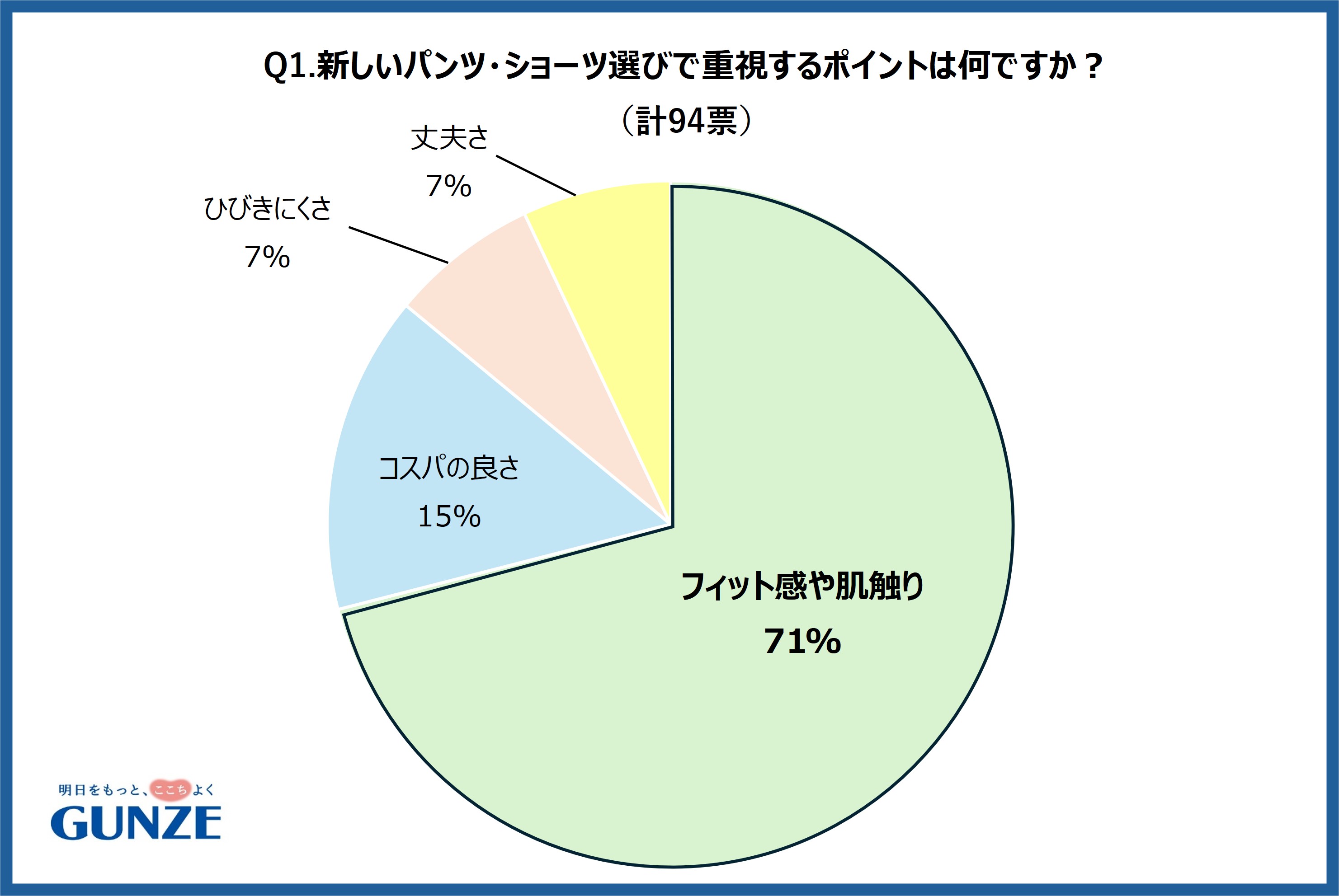 「新しいパンツ・ショーツ選びで重視するポイント」について尋ねたところ、「フィット感や肌触り」が71%でダントツの最多に。昨今重要視される「コスパの良さ」(15%)のほか、「ひびきにくさ」「丈夫さ」(各7%)を大幅に上回った。
