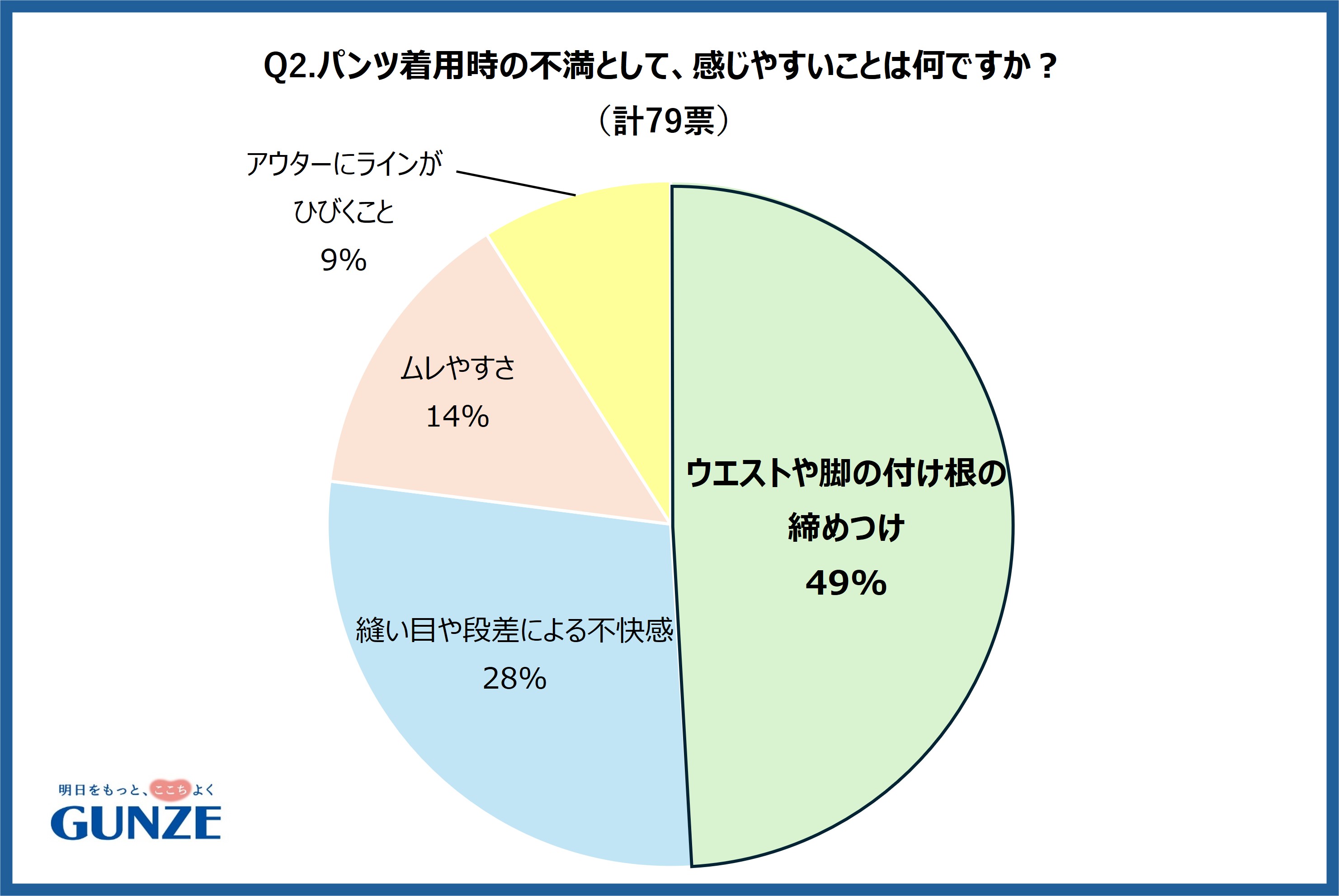 「パンツ着用時の不満として感じやすいことは何か」と尋ねたところ、「ウエストや脚の付け根の締め付け」が49%で最も多く、以下「縫い目や段差による不快感」(28%)、「ムレやすさ」(14%)、「アウターにラインがひびくこと」(9%)と続いた。