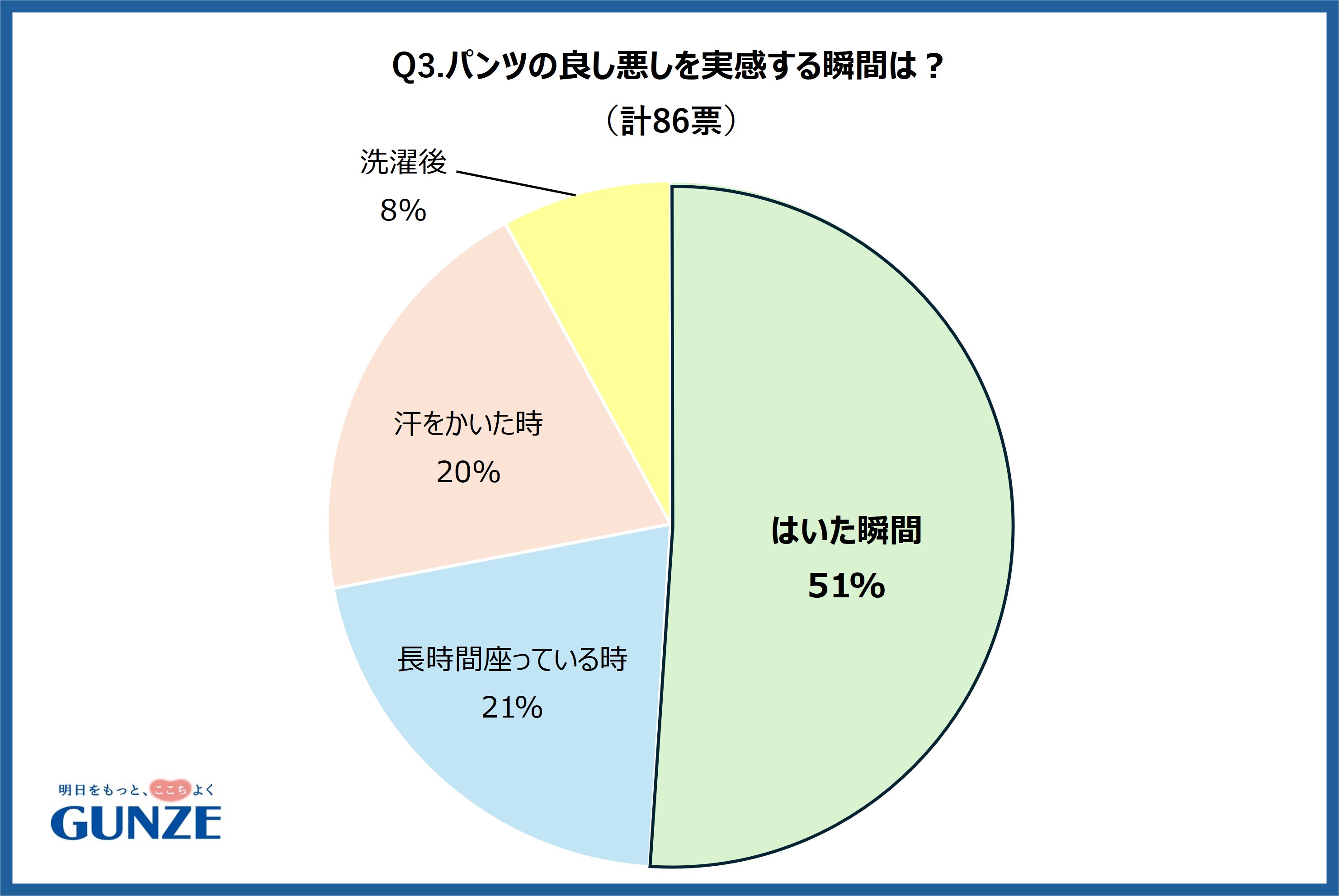 「パンツの良し悪しを実感する瞬間は?」と尋ねたところ、「はいた瞬間」が51%で過半数を占めた。以下「長時間座っている時」(21%)、「汗をかいた時」(20%)、「洗濯後」(8%)と続いた。