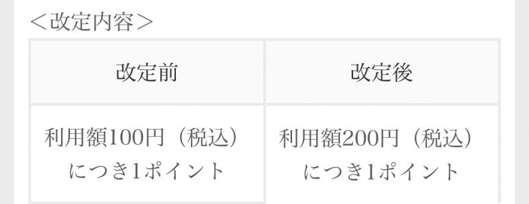 dポイントでも変更があります。今年の2月1日(日)からdポイント還元率の見直しがあります。dカードのポイント還元が100円(税込)につき1ポイントから200円(税込)につき1ポイントに変更になるのです。