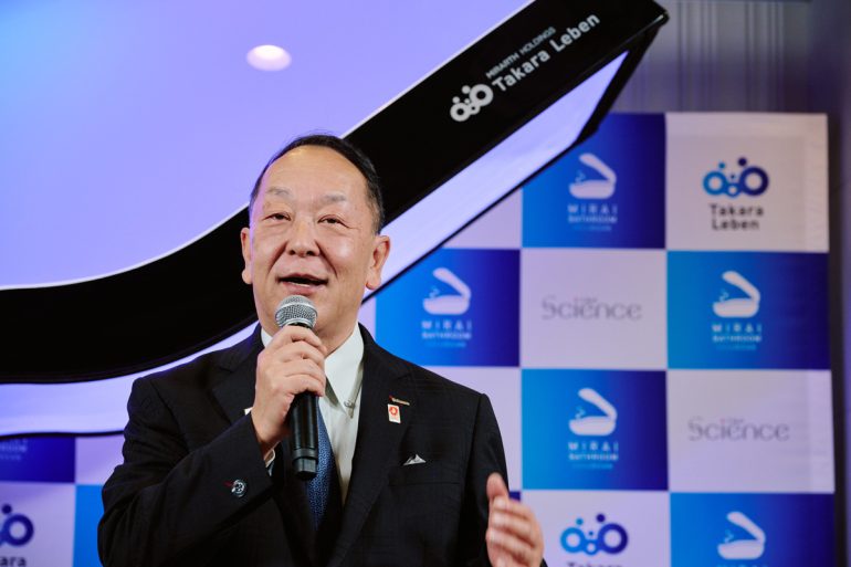 タカラレーベン代表取締役兼社長執行役員・秋澤昭一氏は「このミラバスビジョン、ミラブルシャワーは微細な泡が出ており、身体の汚れを落としてくれます。この『ミライ人間洗濯機』は、まさにそのミラブルシャワーが導入されておりますので、身体の汚れが落ちる。これ(レーベンブランドに導入されている『ルイックプロジェクト』)を(ミライ人間洗濯機に入ることで)体感できる仕組みと理解いただければ」と語った。