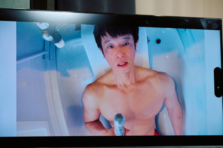 藤本さんが「温度はどういう感じ?」と外から質問すると、「温度も丁度いいし、あったかい。ミストの水圧もすごく気持ちよくて。繊細なミストが身体を洗ってくれている」と説明した。さらに「あ! 今、目の前で映像が流れていますよ!」と実況。