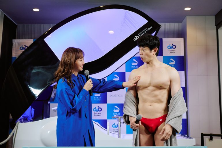 イベントにはお笑い芸人の庄司智春さんと、ミキティことタレントの藤本美貴さん夫婦が登場し、水着姿の庄司さんが実際に『ミライ人間洗濯機』に入ってみることに。青白く光る大きいなカプセル型のマシンを目の前にした庄司さんは、「未来じゃないですか! カッコイイ!」と興奮。自慢の筋肉を披露しながら、中に入った。