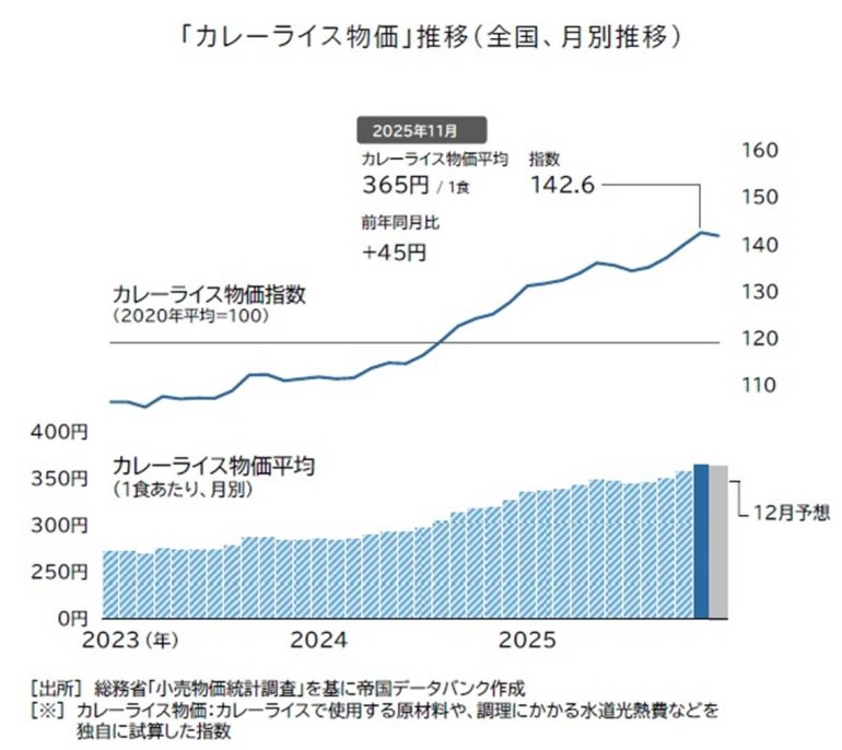 2025年11月分の調査(https://prtimes.jp/main/html/rd/p/000001235.000043465.html)では、カレーライス1食は前年同月の320円から365円となっていて、「米、野菜類、各種原材料の価格上昇を背景に上昇した」とされている。