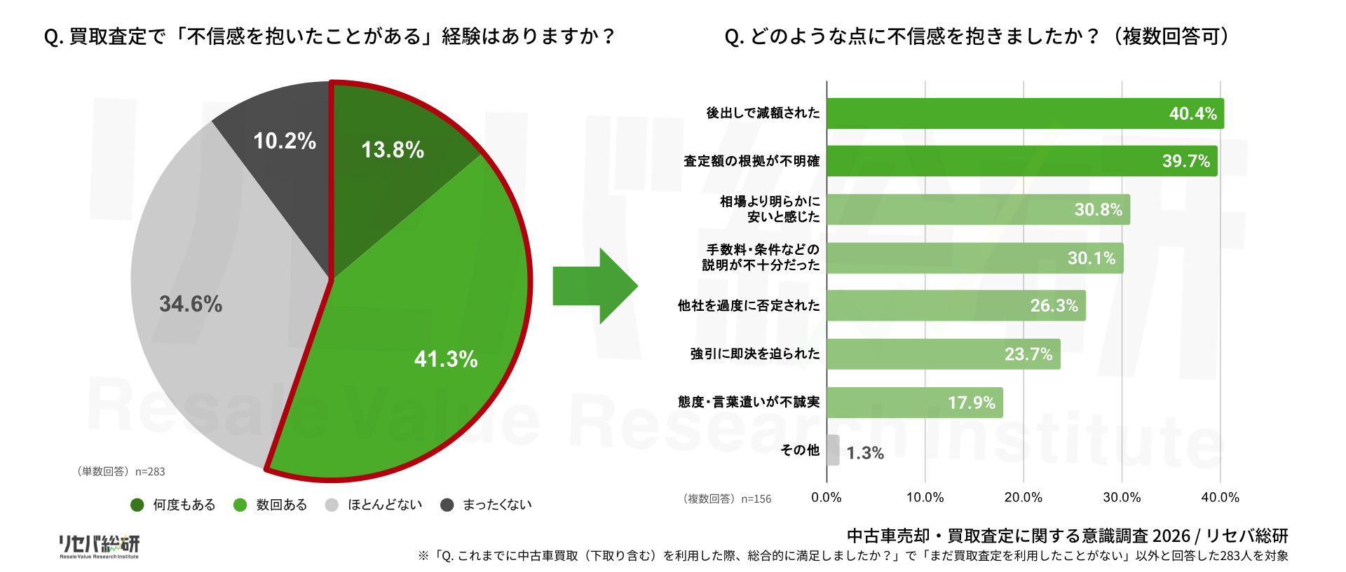不信感を抱いた理由を見ると、最も多かったのは「後出しで減額された」(40.4%)で、以下「査定額の根拠が不明確」(39.7%)、「相場より明らかに安いと感じた」(30.8%)、「手数料・条件などの説明が不十分だった」(30.1%)が続いた。金額そのものだけでなく、説明の透明性やプロセスへの納得感が欠けていることが、不信感につながっている様子がうかがえる。