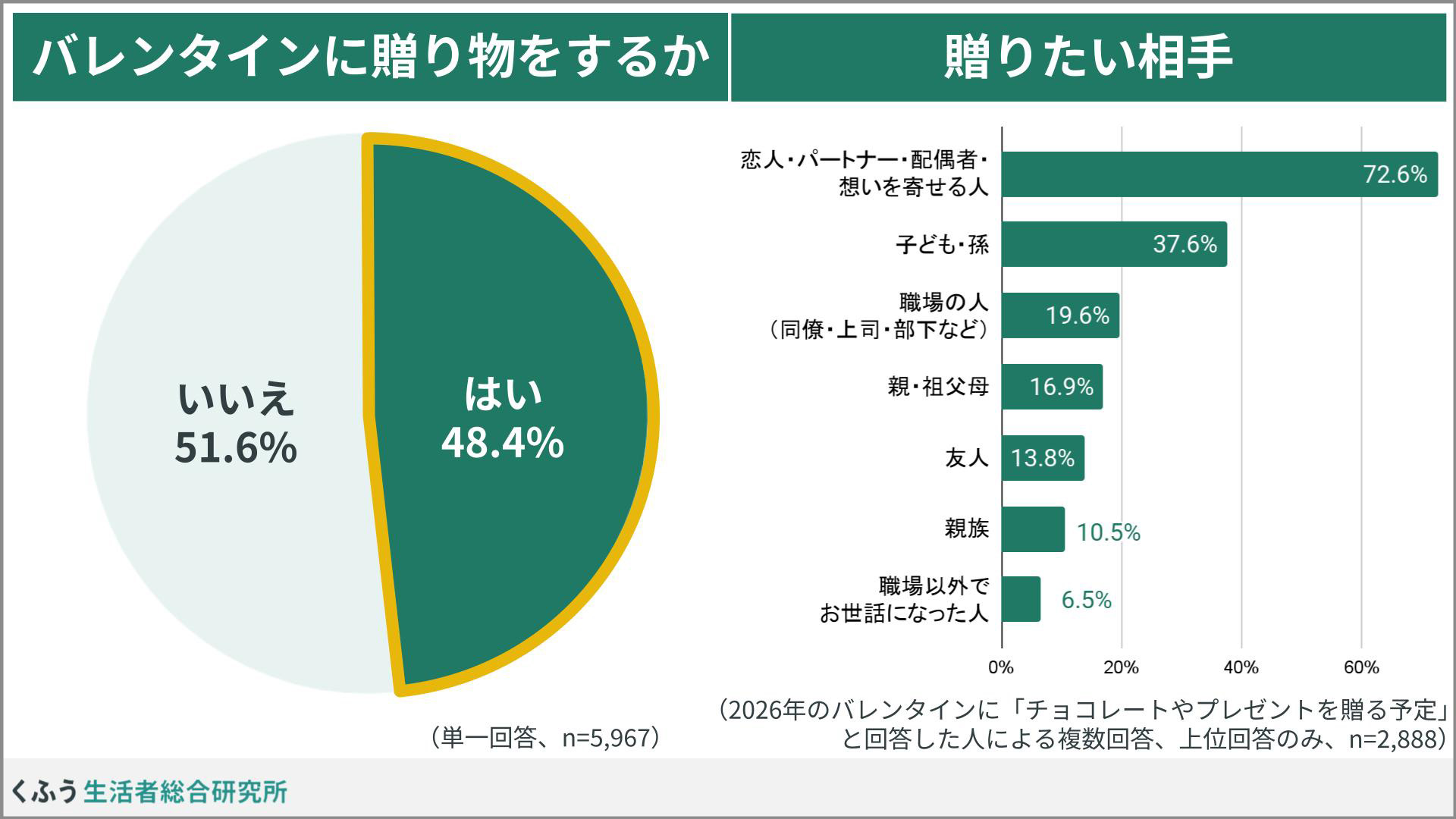 生活者と社会の生活満足度向上に資する研究・発信を行う「くふう生活者総合研究所」(以下、くふう総研)は、生活者5,967名を対象に2026年のバレンタインデーに関する調査を実施したので、結果を紹介しよう。