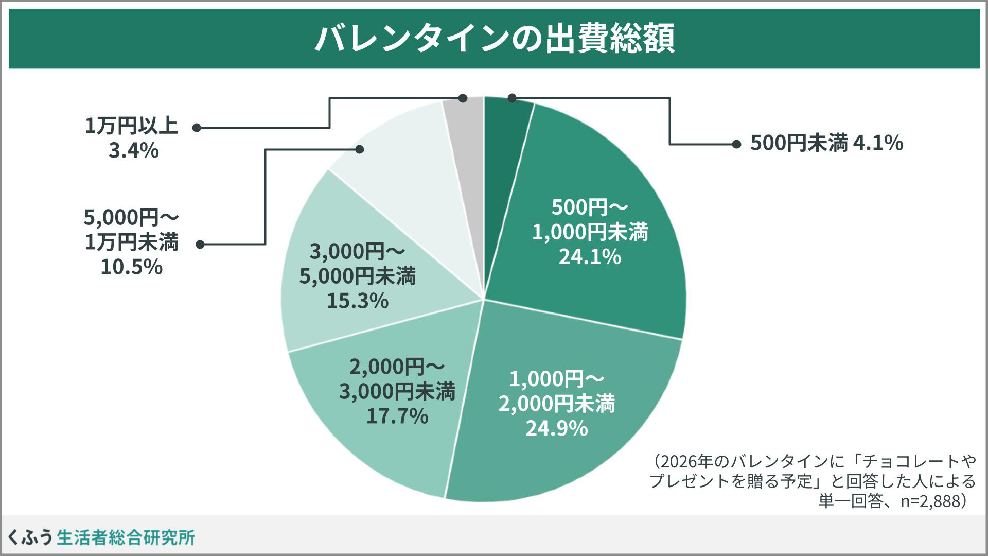 バレンタインの贈り物の予算(出費総額)は、「1,000円~2,000円未満」の価格帯が24.9%で最も多くなった。