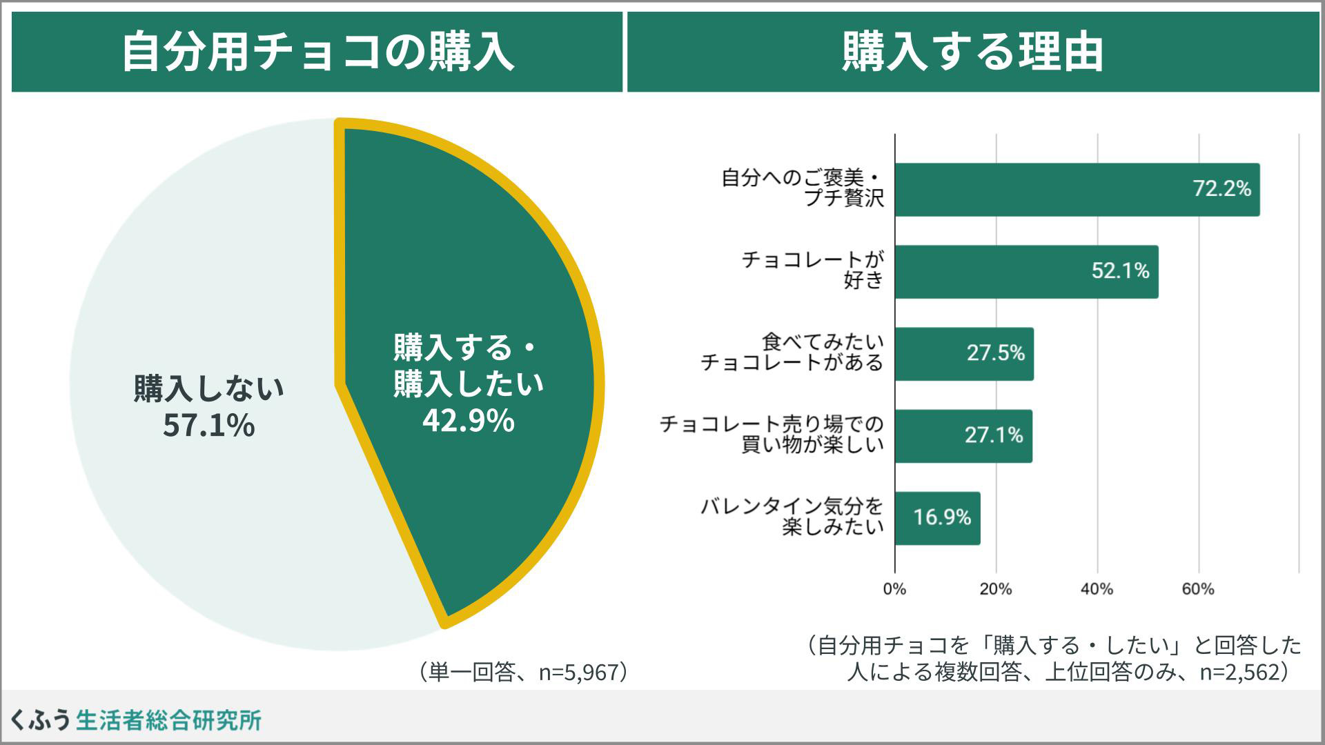 バレンタインのチョコレートを自分用に購入するという人は4割超(42.9%)。購入する理由は「自分へのご褒美・プチ贅沢」(72.2%)と回答した人が多い結果に。