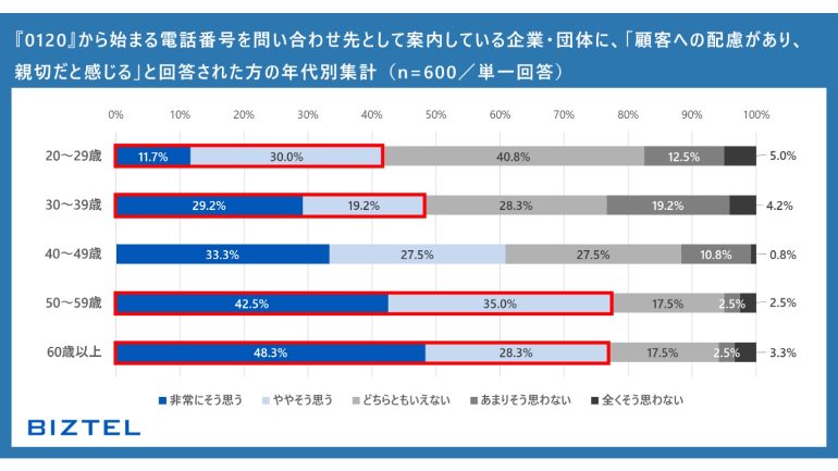 一方、50〜60代以上ではいずれも8割に迫る結果となり、年齢層が上がるほど0120番号に対する肯定的な評価が顕著に表れている。