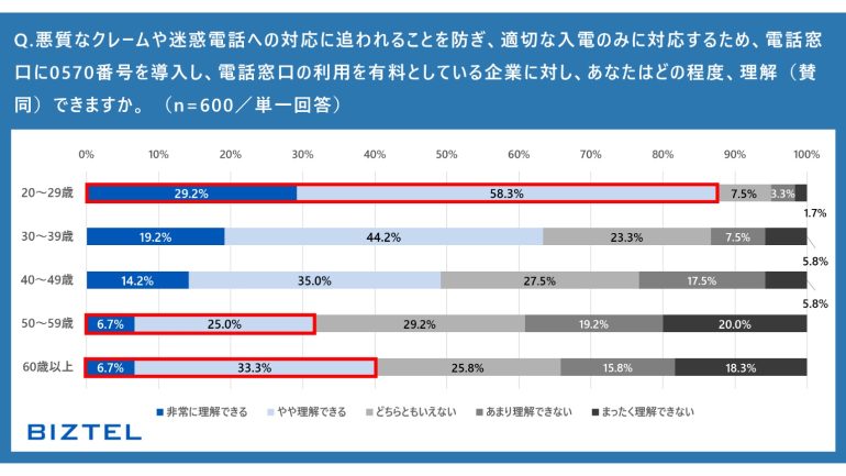 しかし、0570番号の採用背景に対する理解度を年代別に見ると、20代では約9割が「理解できる」と回答している一方で、50〜60代以上では「理解できる」と回答した割合が相対的に低い結果となっている。