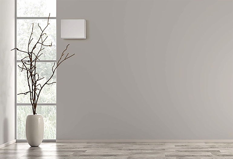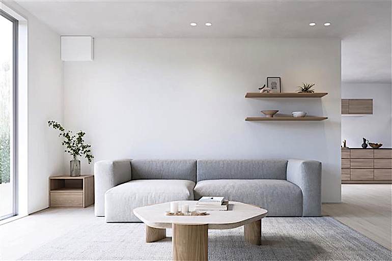 まずは本体サイズを業界最薄*の奥行100mmとし、さらに天井面や壁面にすき間なく設置できる、クリアランスゼロも実現。インテリアでの不用意な存在感を抑えています。
