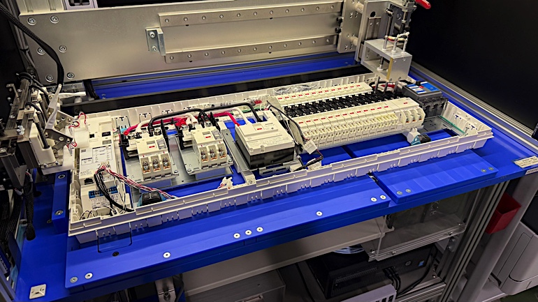 組み立てが終わったブレーカは、単体での販売分を別に、分電盤への組み込み工程を踏みます。
