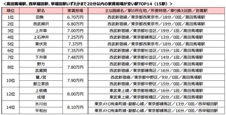 【調査対象駅】SUUMOに掲載されている高田馬場駅、西早稲田駅、早稲田駅(メトロ、都電)いずれかまで20分以内の駅(掲載物件が20件以上ある駅に限る)