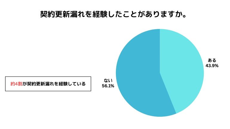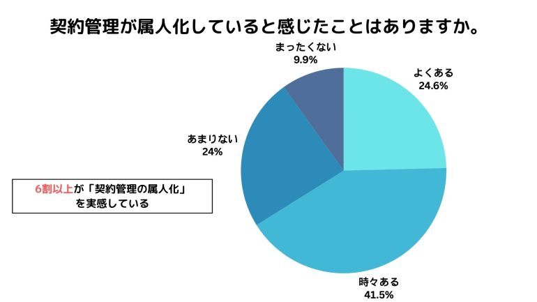 契約更新漏れを「経験したことがある」と回答した人は43.9%(3人に1人以上)にのぼり、さらに契約管理の属人化について「よくある(24.6%)」「時々ある(41.5%)」と感じている人は合計66.1%となった。