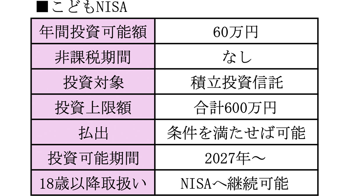 新たに開始される「こどもNISA」は、年間60万円まで投資可能で、上限は600万円までとなる予定だ。NISAのつみたて投資枠と同様の、積立による投資信託への投資が対象となる。
